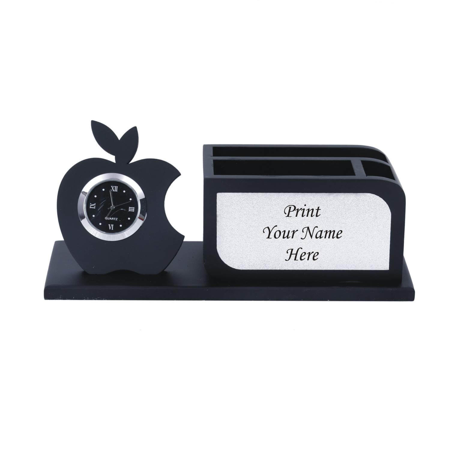 Description : About Personalized Gift, Name Printed, Wooden Pen Stand with Clock, Mobile, Card Holder (Black & Silver)